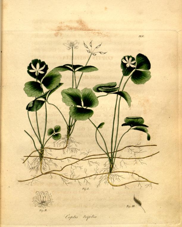 | Coptis trifolia or Three-leaf Goldenthread from American Medical Botany: Being a Collection of the Native Medicinal Plants of the United States by Jacob Bigelow. v.1. 1817. p.60. Digitized by Missouri Botanical Garden. http://biodiversitylibrary.org/page/2955644. |