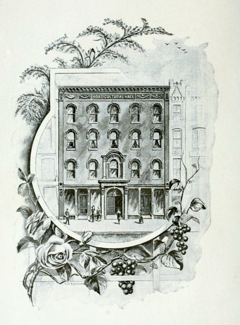 | The first Horticultural Hall, from Transactions, 1891-1892 (image in the public domain, from Wikipedia) |
