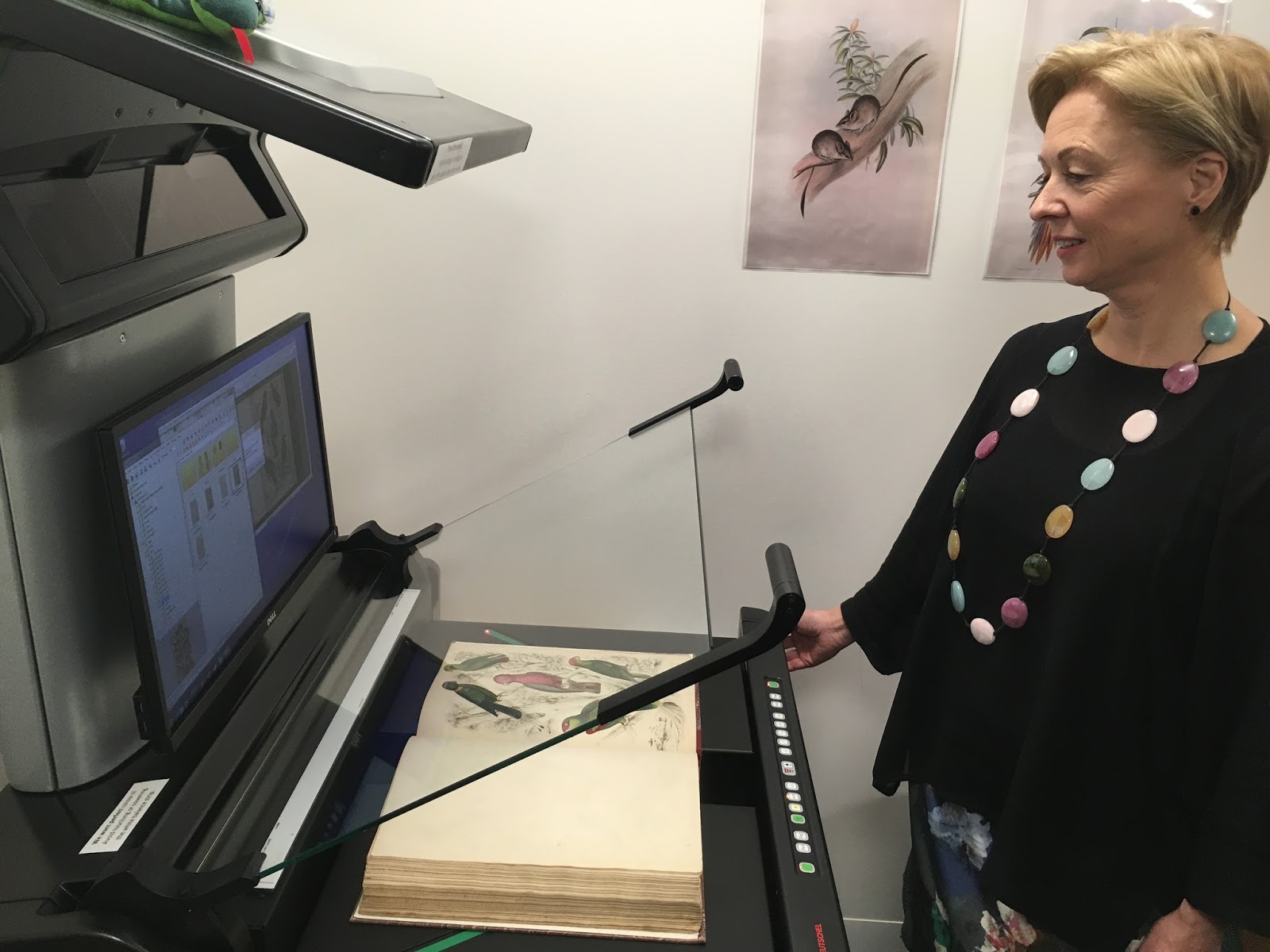| Museums Victoria CEO Lynley Marshall scanning the first page for BHL Australia on the new scanner. Photo Credit: Nicole Kearney. |