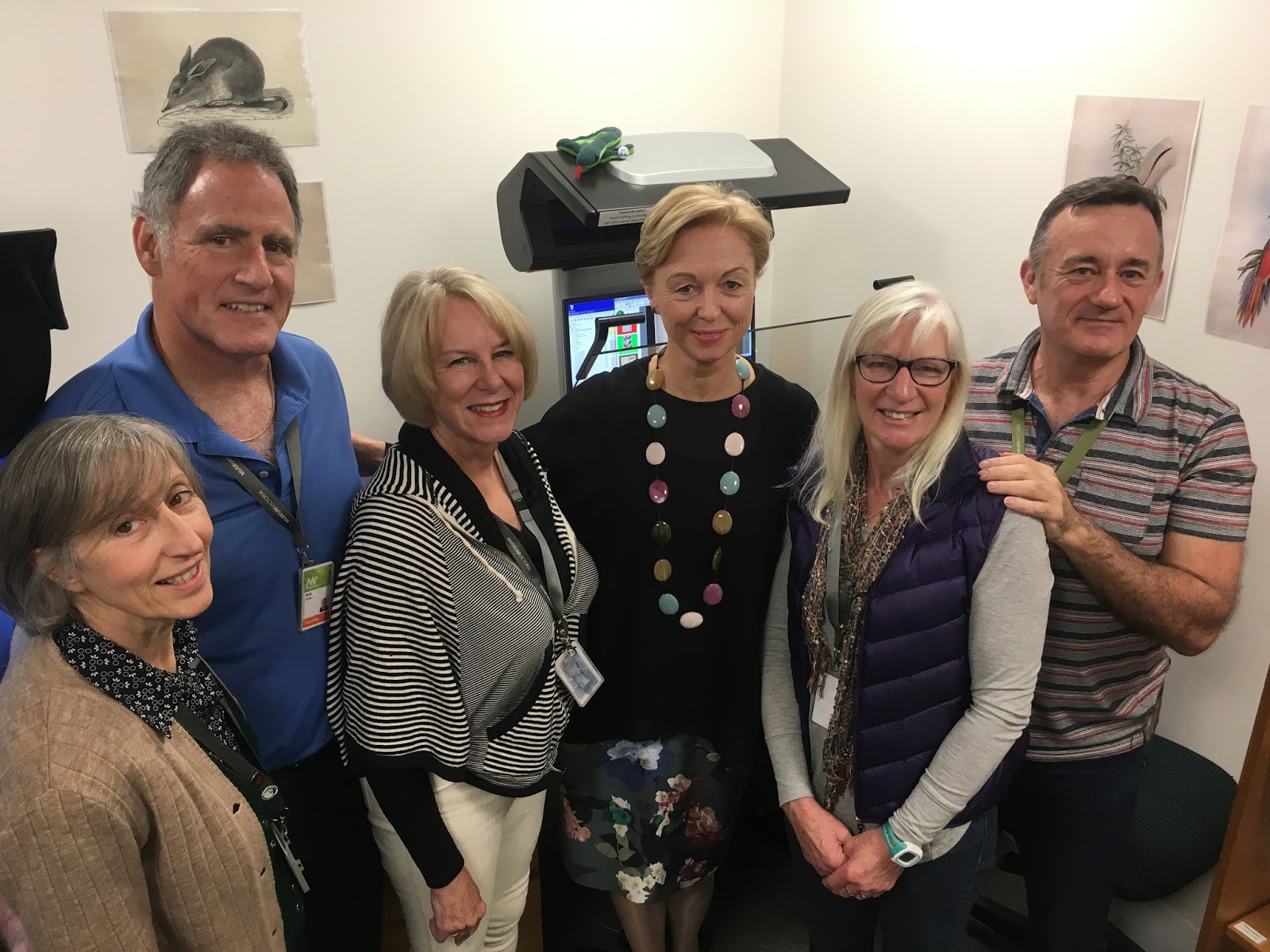 | BHL Australia volunteers with Museums Victoria CEO Lynley Marshall (center) in front of the new BHL Australia scanner. Photo Credit: Nicole Kearney. |