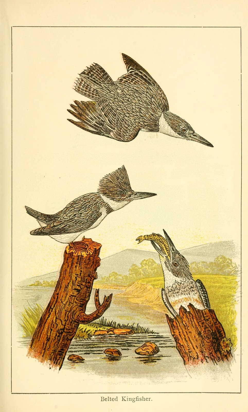 | Belted Kingfisher. Warren, Benjamin Harry. Some Birds and Mammals which Destroy Fish and Game. Clarence M. Busch, state printer of Pennsylvania, 1897. Digitized by The Library of Congress. http://www.biodiversitylibrary.org/page/29736925. Illustration reproduced from Audubon’s Birds of America. |