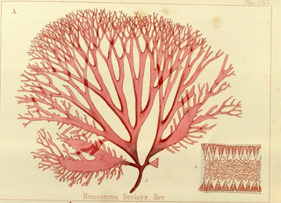 My most recent BHL adventure resulted from tagging an album of images from the boringly named but absolutely fabulous Botany of the Antarctic voyage of H. M. discovery ships Erebus and Terror in the years 1839-1843. Amongst the many images in this album was one of a particular species of seaweed – Nemastoma feredayae.