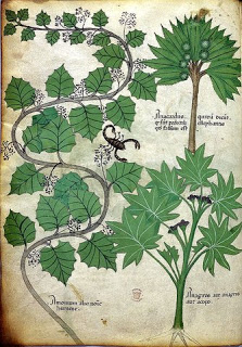 | Plants and a Scorpion, in “Herbal” Manuscript folio 3v (Lombardy, Italy, around 1440). British Library Sloane 4016. This illustration indicates that a sting from a scorpion may be soothed by plants. |