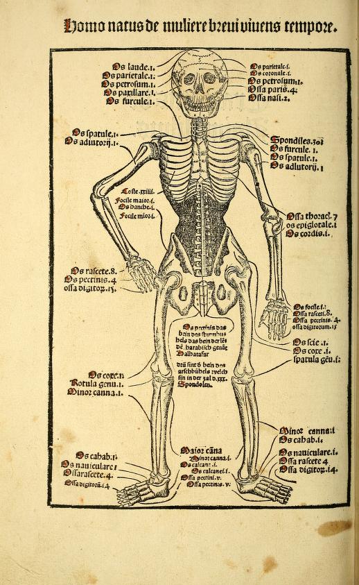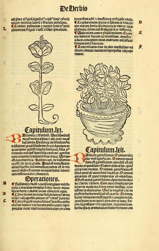 A pot of basil: may this be symbolic or practical, whether signifying divine or earthly love, used as a culinary ingredient or insect repellent, to soothe a sad soul, or just a convenient place to store a lover’s severed head. The iconography of the image in printed books, manuscripts and paintings is yet to be fully explored. The bibliography of early printed herbals—endless editions, translations, fragments, versions, and reuse and copying of woodcuts—is a complex and difficult task to sort out. But the increasing number of scanned early herbals in the Biodiversity Heritage Library allows for easy exploration of these extremely rare works. Perhaps Prüss’ Ortus Sanitatis has a unique basil pot because of an inventive author/illustrator. The book does contain a woodcut of the human skeleton, the first appearance of one in an herbal.