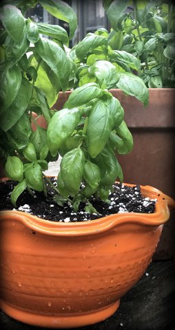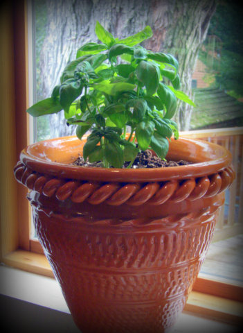 Should you happen upon any, please send me your finds of illustrations of basil in a pot. Or, a picture of the herb growing in a container on your windowsill.