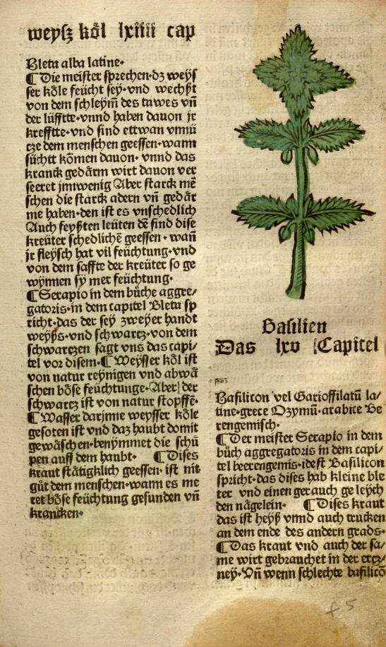| A more typical illustration of basil from an earlier period, showing the plant truncated. The Smithsonian Libraries‘ Gart der Gesundheit [Ulm?: Konrad Dinckmut?, 1487?], often attributed to Johannes von Cuba. The Missouri Botanical Garden’s copy has been scanned by BHL (link here). |