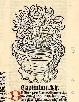In Johann Prüss’ late 15th-century herbal, Ortus Sanitatis (Garden of Health), a bushy basil plant is portrayed growing in a decorative container. The book, a popular pharmacopoeia of various remedies drawn from ancient and medieval authors, was intended to be practical. The woodcuts are somewhat stylized and simple, meant to be easily identifiable to readers such as a doctor, apothecary, spice merchant, monk, or household member.
