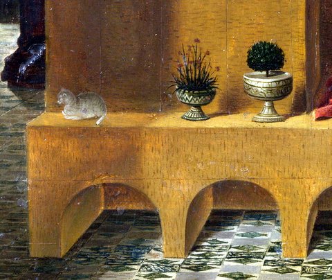 | Detail of Antonello da Messina’s “St. Jerome in his Study,” of alfabeguers (and kitten) approximately 1475 (National Gallery, London) |