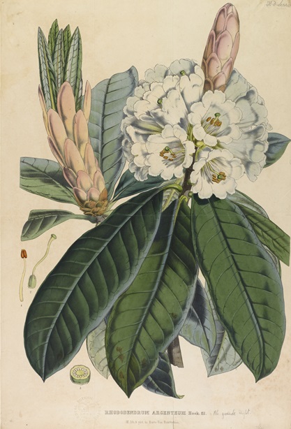 | Rhododendron argenteum one of Hooker’s new species published in The Rhododendrons of Sikkim-Himalaya. http://s.si.edu/2tkRKAP. Drawing by Joseph Dalton Hooker. Lithographed by Walter Hood Fitch. Digitized by the Missouri Botanical Garden. |