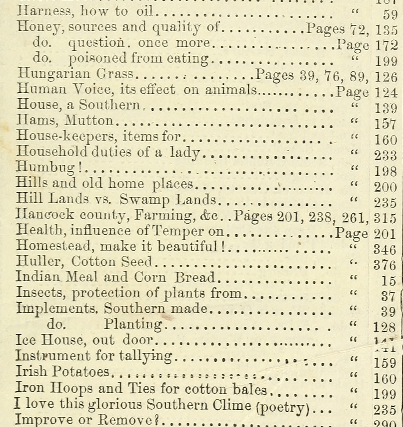 | Sample of the index to v.17 (1859), showing the topical breadth of the journal. http://www.biodiversitylibrary.org/page/53013673. Digitized by Cherokee Garden Library, Kenan Research Center at the Atlanta History Center. |