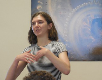 | Beatrice Steinert speaking at the MBLWHOI Library about drawing cells of marine slipper shells (photo: Matthew Person). |