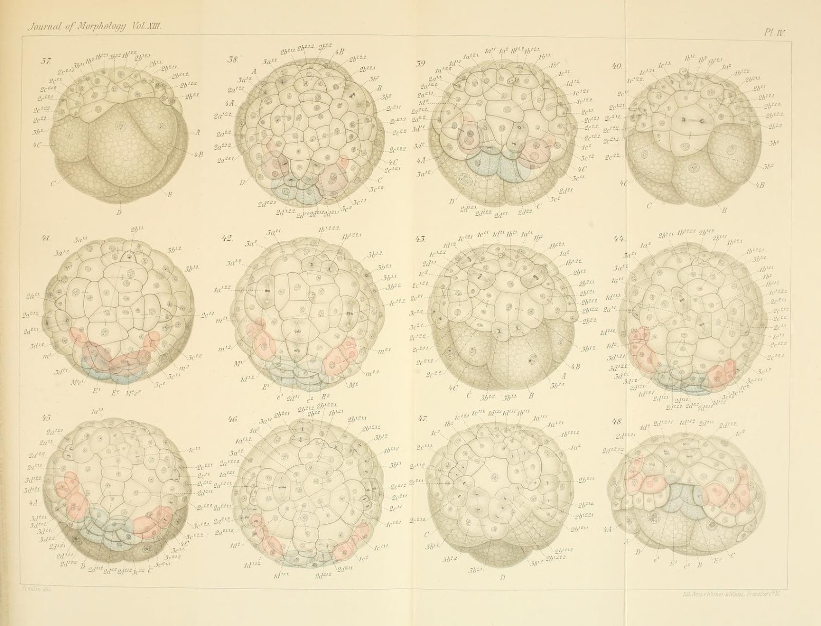 Steinert used both physical texts and BHL content to inform the above mentioned duplication of experimental work performed almost 120 years ago. Conklin’s handwritten Johns Hopkins University digitized doctoral dissertation, The embryology of Crepidula (1891), can be contrasted with the later published full version of the same title (Journal of Morphology v.13 (1897)), by which time Conklin held a professorship in comparative embryology at Johns Hopkins University. Plate IV below is an interesting example of the finished drawings produced using Conklin’s camera lucida sketches.