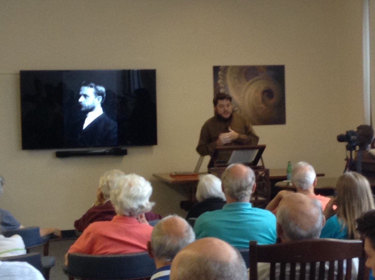 | Sean Cohmer speaking at the MBLWHOI Library about Thomas Hunt Morgan (photo: Matt Person). |