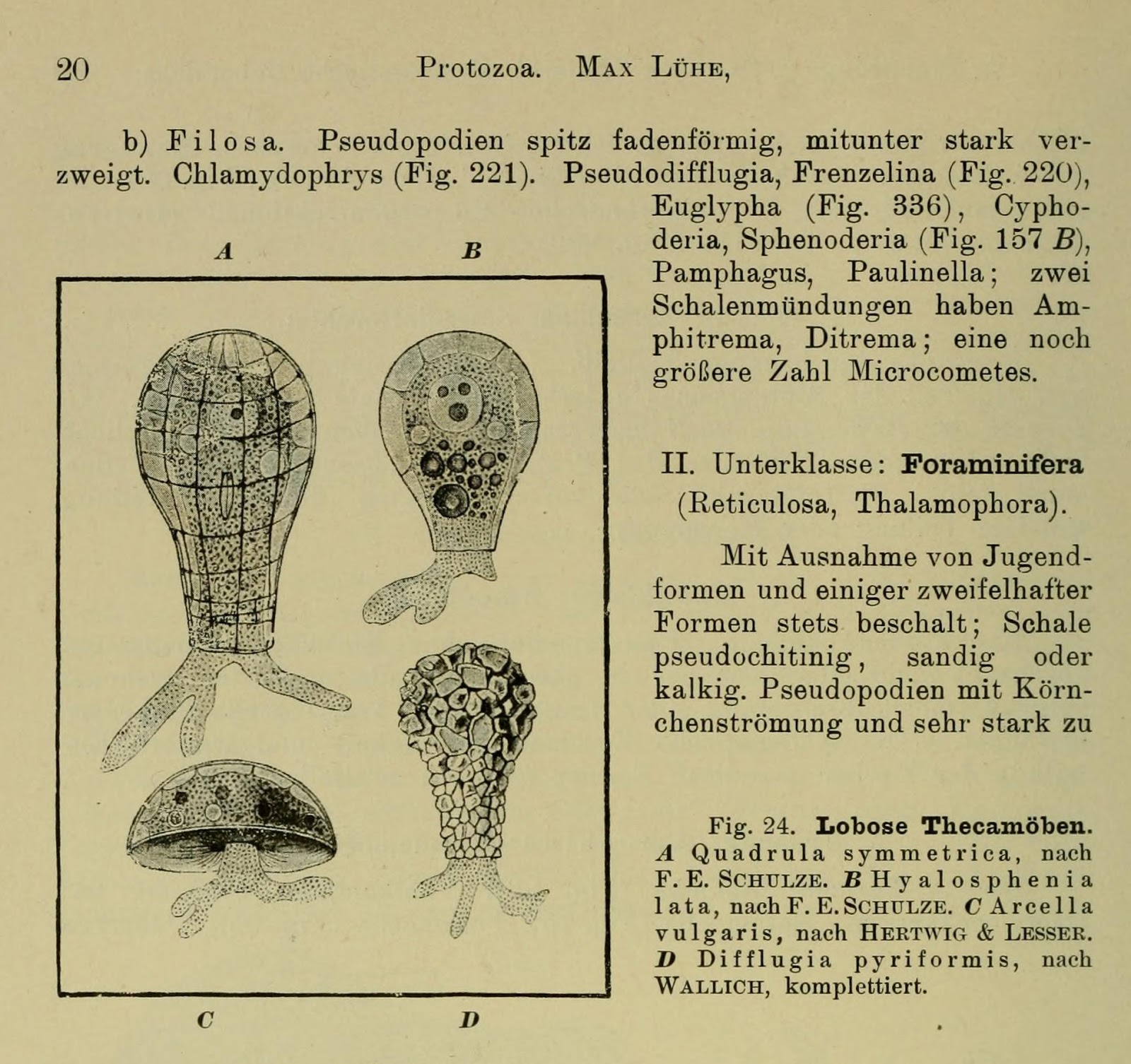 | Testate amoebae described and illustrated by Max Lühe. Handbuch der Morphologie der wirbellosen Tiere. Bd. 1 (1913). Digitized by the American Museum of Natural History. http://s.si.edu/2tiM3BF. |