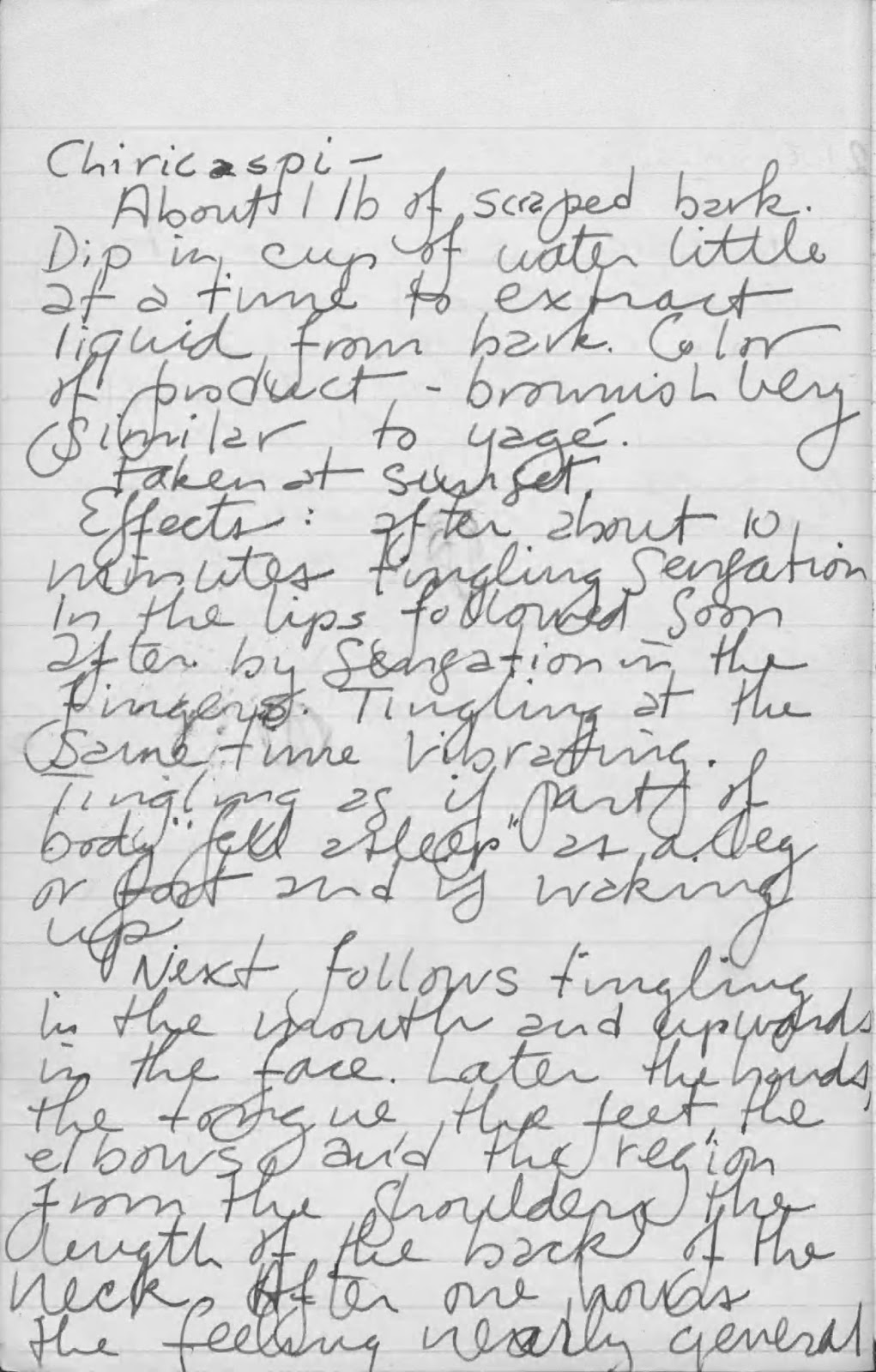 The shaman also brought from the forest a related plant that Plowman immediately identified as a new-to-science species, which he later named Brunfelsia chiricaspi, described on the following page. Wishing to confirm that this new plant also had similar properties as a drug, he asked the shaman to prepare it. At first the shaman refused his request, describing the plant as a “dangerous messenger of the forest,” but eventually relented. Plowman describes his experience from the drug, the effects of which he began to feel within ten minutes, within these pages of his field book.