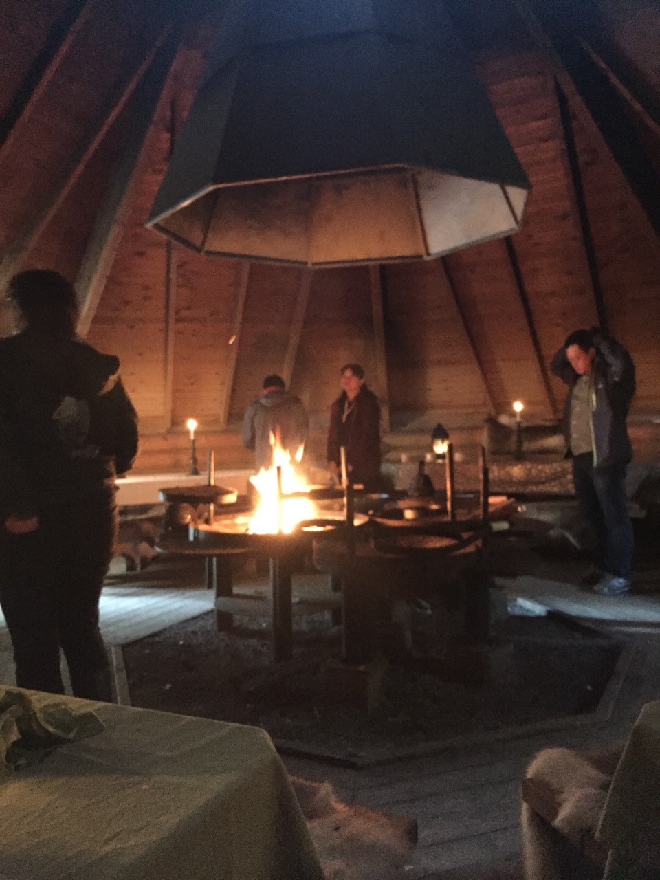 After about 2 hours of mushroom hunting, we arrived at the Kattila Lappih Hut where we were treated to a lunch of salmon and potatoes cooked over an open fire. Lunch was served at long wooden tables with candles and we sat on benches covered with reindeer furs.