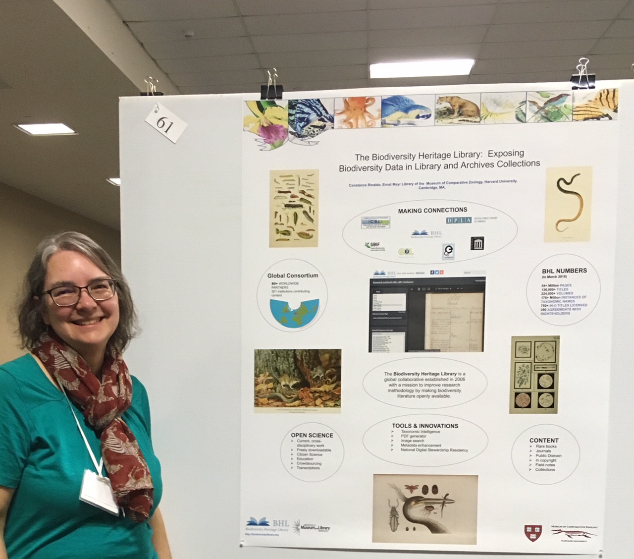 Constance Rinaldo (Librarian of the Ernst Mayr Library and Museum of Comparative Zoology Archives; Chair of the BHL Executive Committee) standing with her BHL poster at the Northeast Natural History Conference.