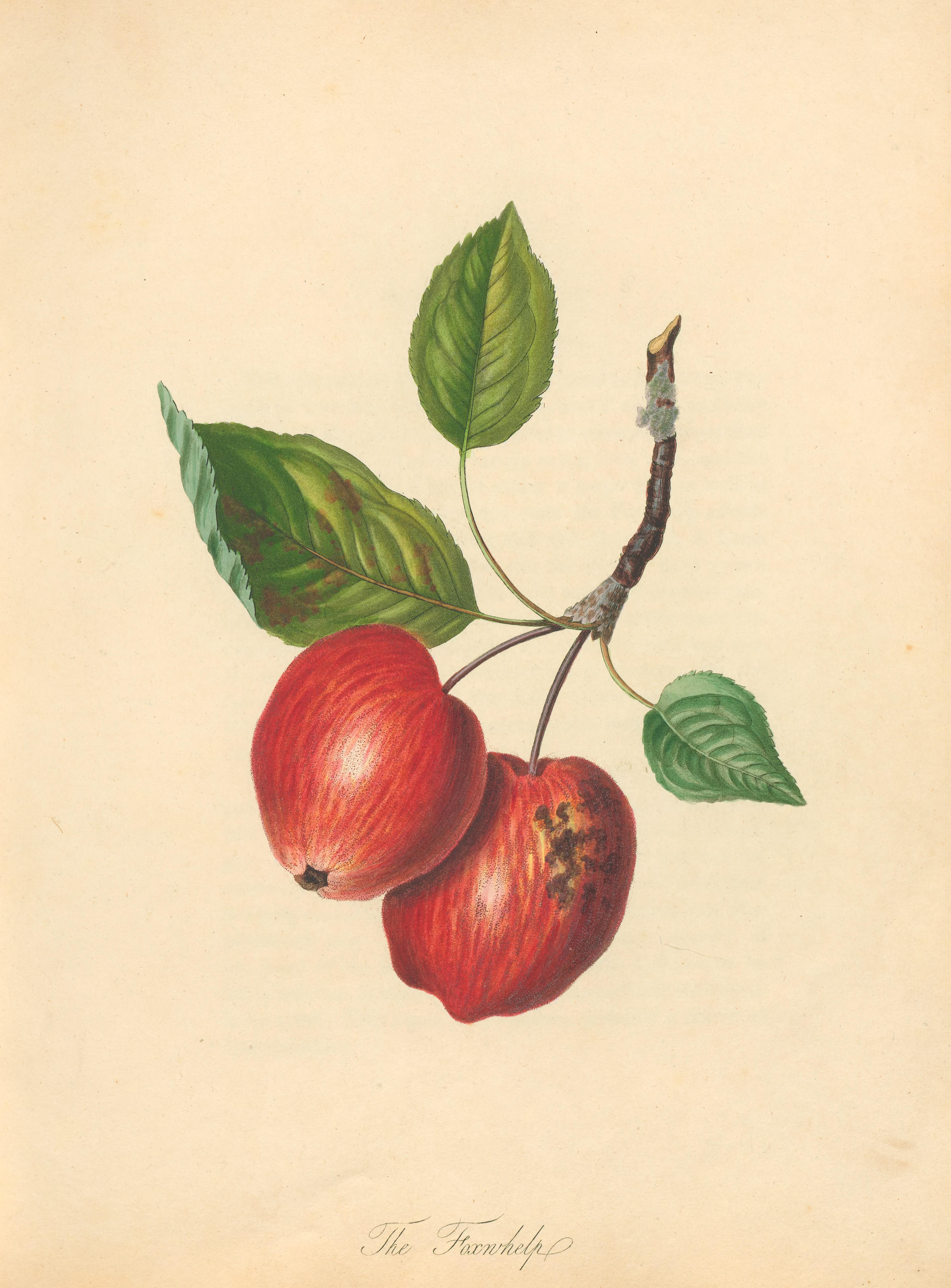 The cider apple variety “Foxwhelp.” Knight, Thomas Andrew. Pomona Herefordiensis. 1811. Digitized by Cornell University Library. https://biodiversitylibrary.org/page/55941638.