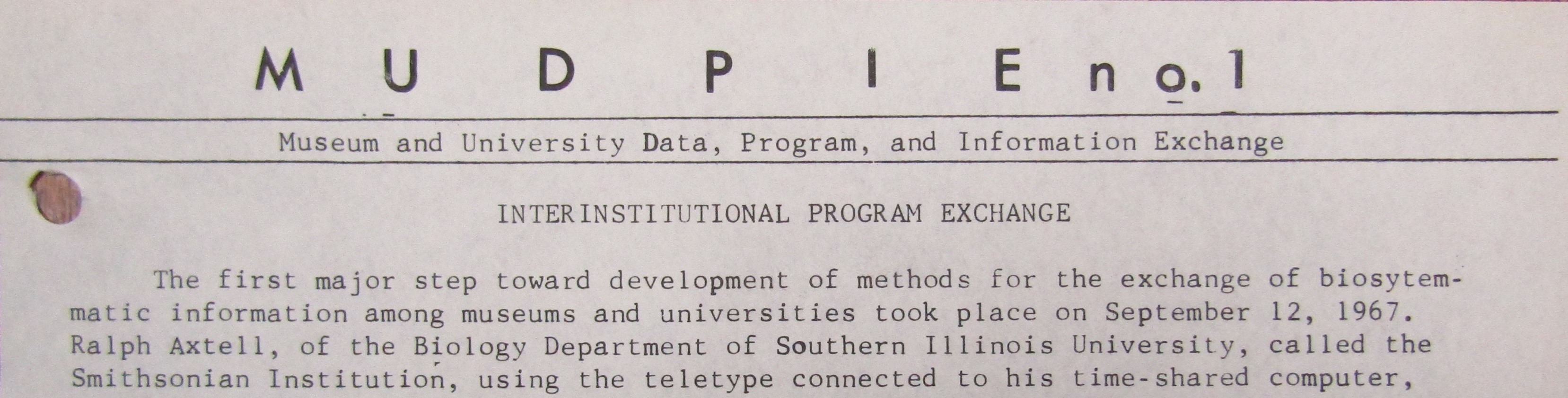 The following day, Dr. James A. Peters produced the inaugural issue of the MUDPIE (Museum and University Data Program and Information Exchange) Newsletter.