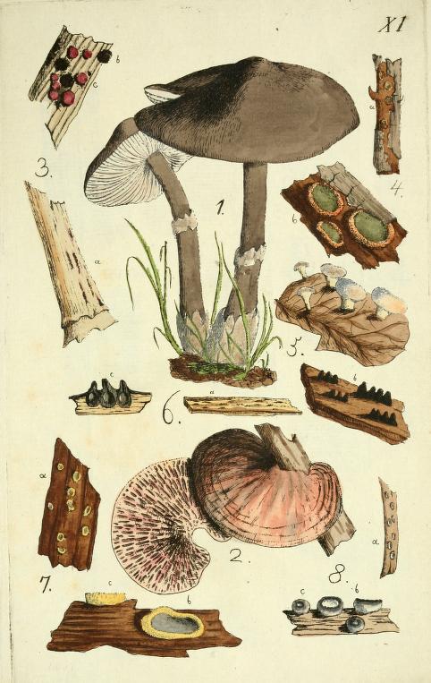 Plate 11. Conspectus fungorum in Lusatiae Superioris agro Niskiensi crescentium, e methodo Persooniana(1805). Figures based on drawings by Schweinitz. Icones fungorum Niskiensium served as a sketchbook to inform this work. Contributed to BHL by the LuEsther T. Mertz Library of The New York Botanical Garden.