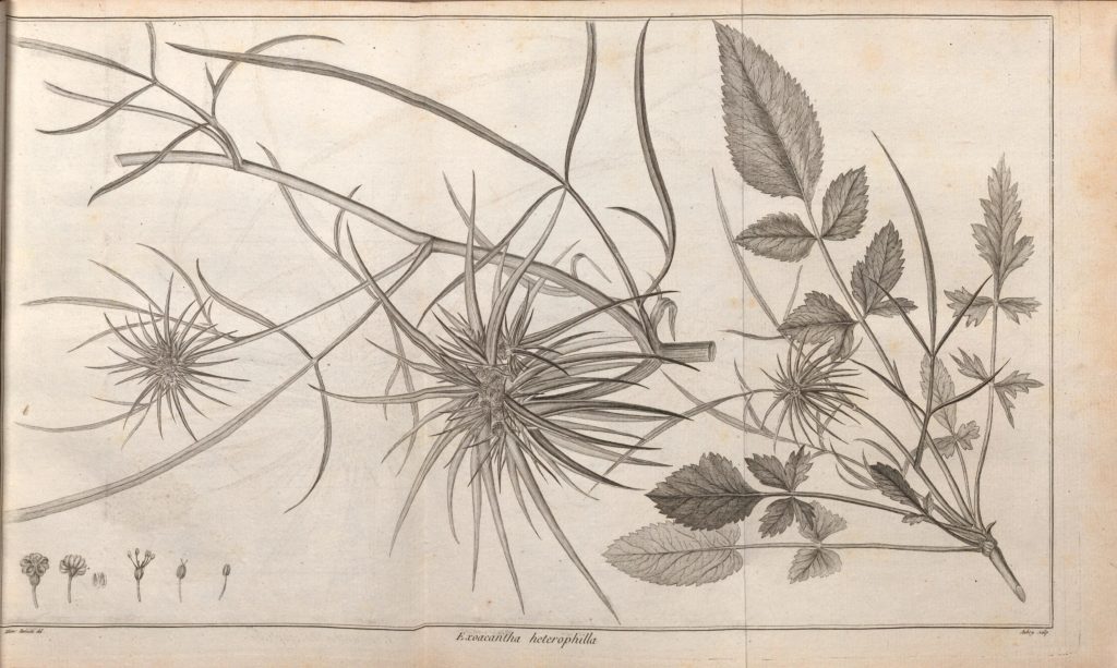 After the “Decas Second” was issued in 1791, featuring 18 pages of text and another 10 plates again by the Redouté brothers, Icones Plantarum Syriae Rariorum experienced a hiatus in publication of nearly two decades as Labillardière embarked on an expedition under Rear Admiral Bruni d’Entrecasteaux in search of the ships La Boussole and L’Astrolabe, which had disappeared several years earlier after leaving Botany Bay, Australia. The voyage provided Labillardière with the opportunity to collect additional botanical specimens in Australia and Tasmania (Allorge 2006, 306).