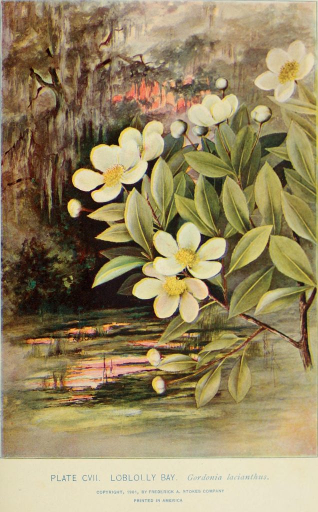 “Loblolly Bay. Gordonia lacianthus.” Lounsberry and Rowan. Southern wild flowers and trees. 1901. Contributed in BHL by NCSU Libraries.