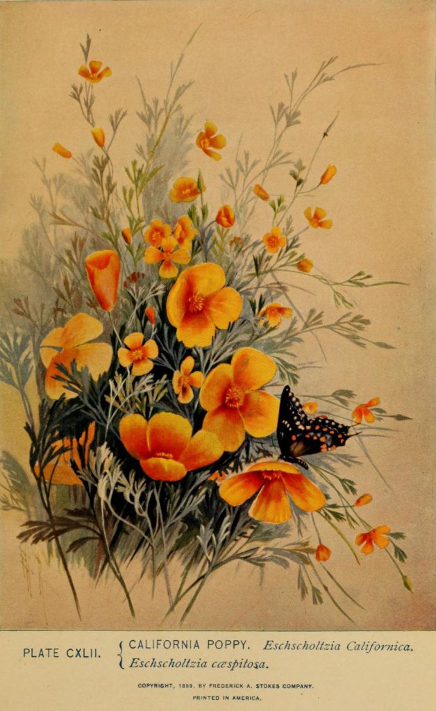 “California poppy, Eschscholtzia Californica and caespitosa.” Lounsberry and Rowan. A guide to the wild flowers. 1899. Contributed in BHL by New York Botanical Garden, LuEsther T. Mertz Library.