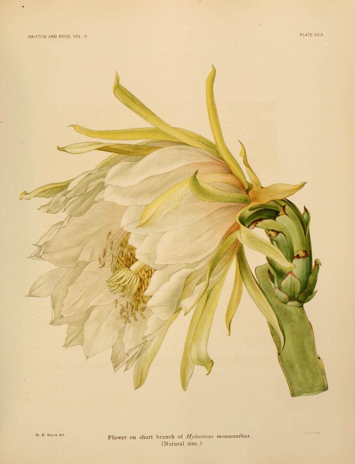 Illustration of Hylocereus monacanthus by Mary Eaton, The Cactaceae, . Contributed in BHL from The New York Botanical Garden.