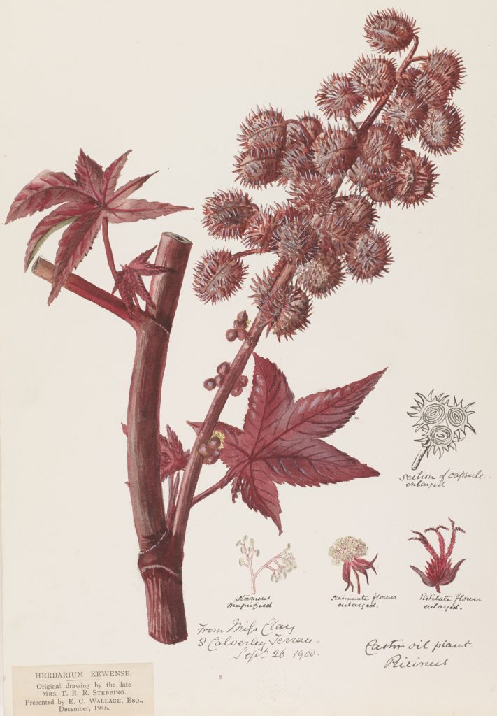 Watercolour of a Castor oil plant (Ricinus communis) showing various enlarged sections by Mary Anne Stebbing (c1845 – 1927). Copyright of Royal Botanic Gardens Kew.