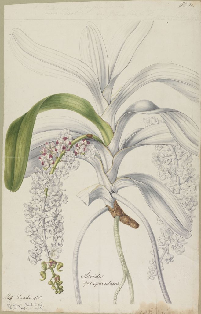 A plate for Sertum Orchidaceum entitled Aerides quinquevulnera by Sarah Anne Drake (1803 – 1857). Copyright of Royal Botanic Gardens Kew.