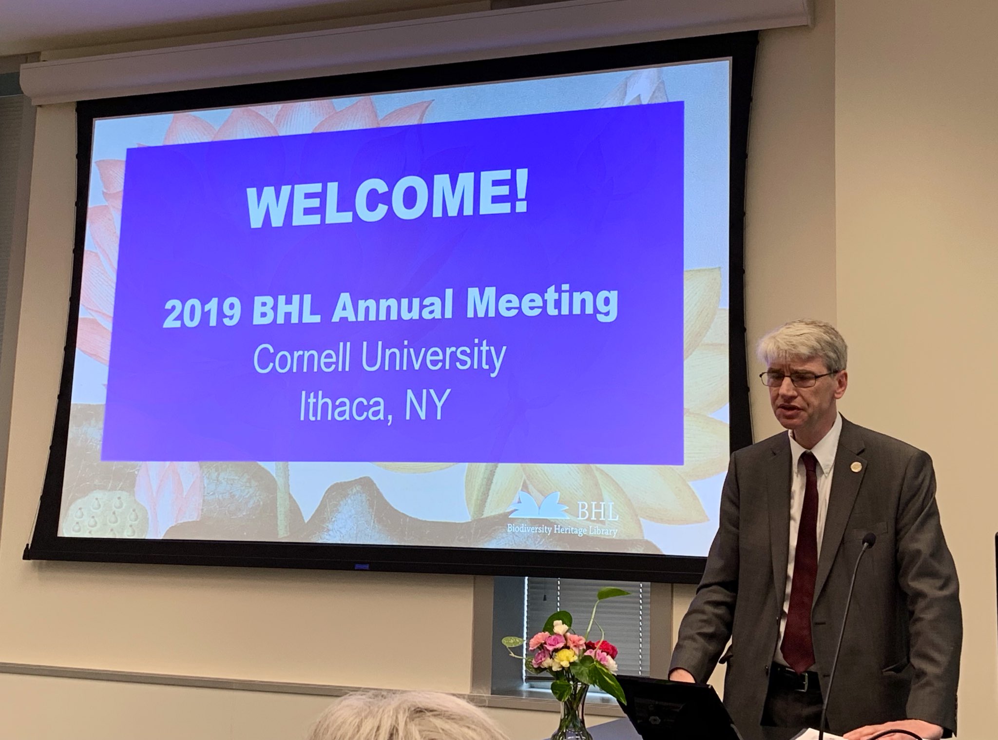 Gerald Beasley (University Librarian, Cornell University) welcoming attendees to the 2019 BHL Annual Meeting at the Albert R. Mann Library. Photo by: Nicole Kearney.