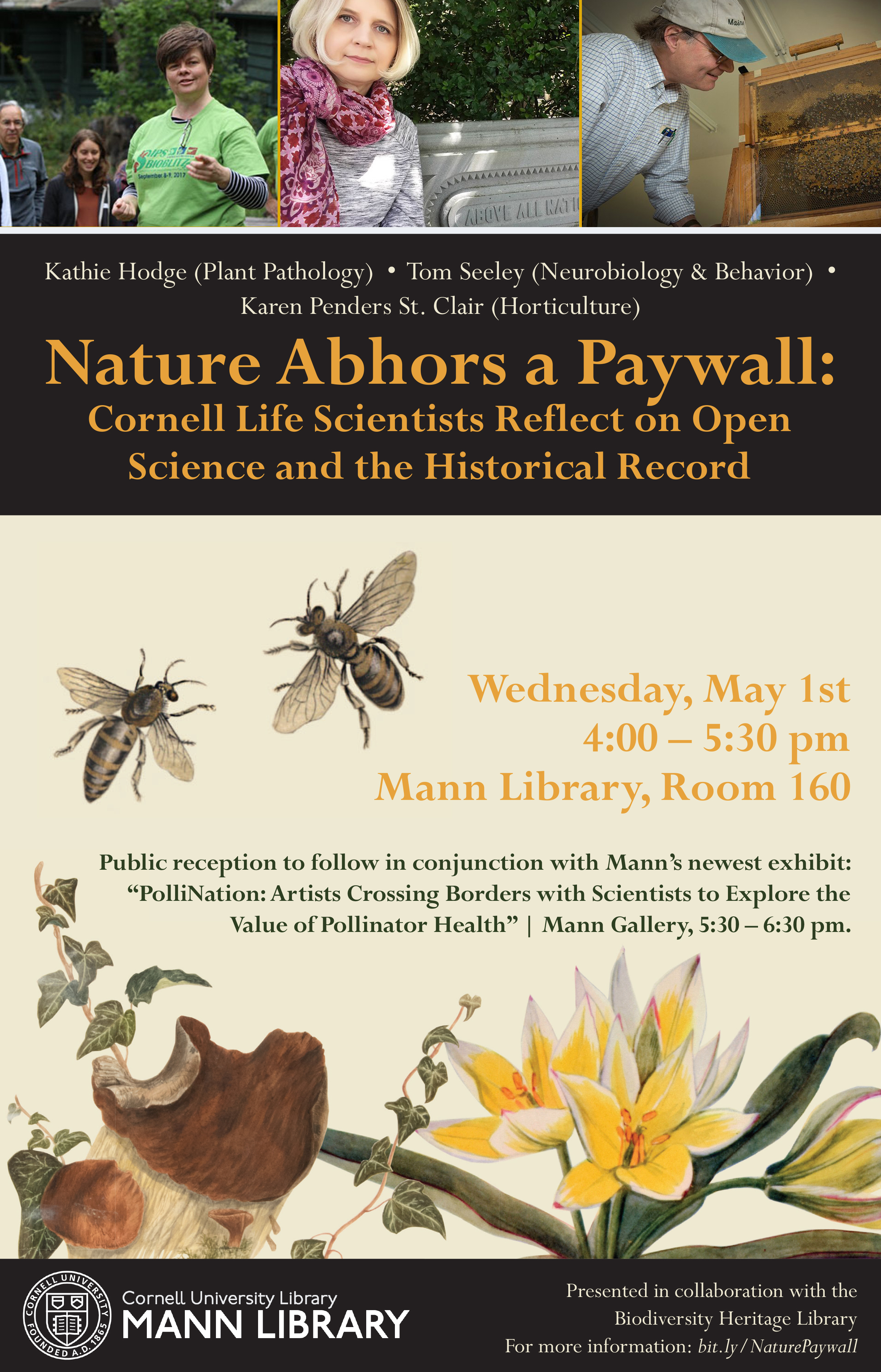 Top: Speakers at the BHL Public Day Panel Session, L to R: Prof. Kathie Hodge; Dr. Karen Penders St. Clair; Prof. Tom Seeley. Below: Promotional Flyer for the public event. Photos and graphic courtesy of Mann Library.