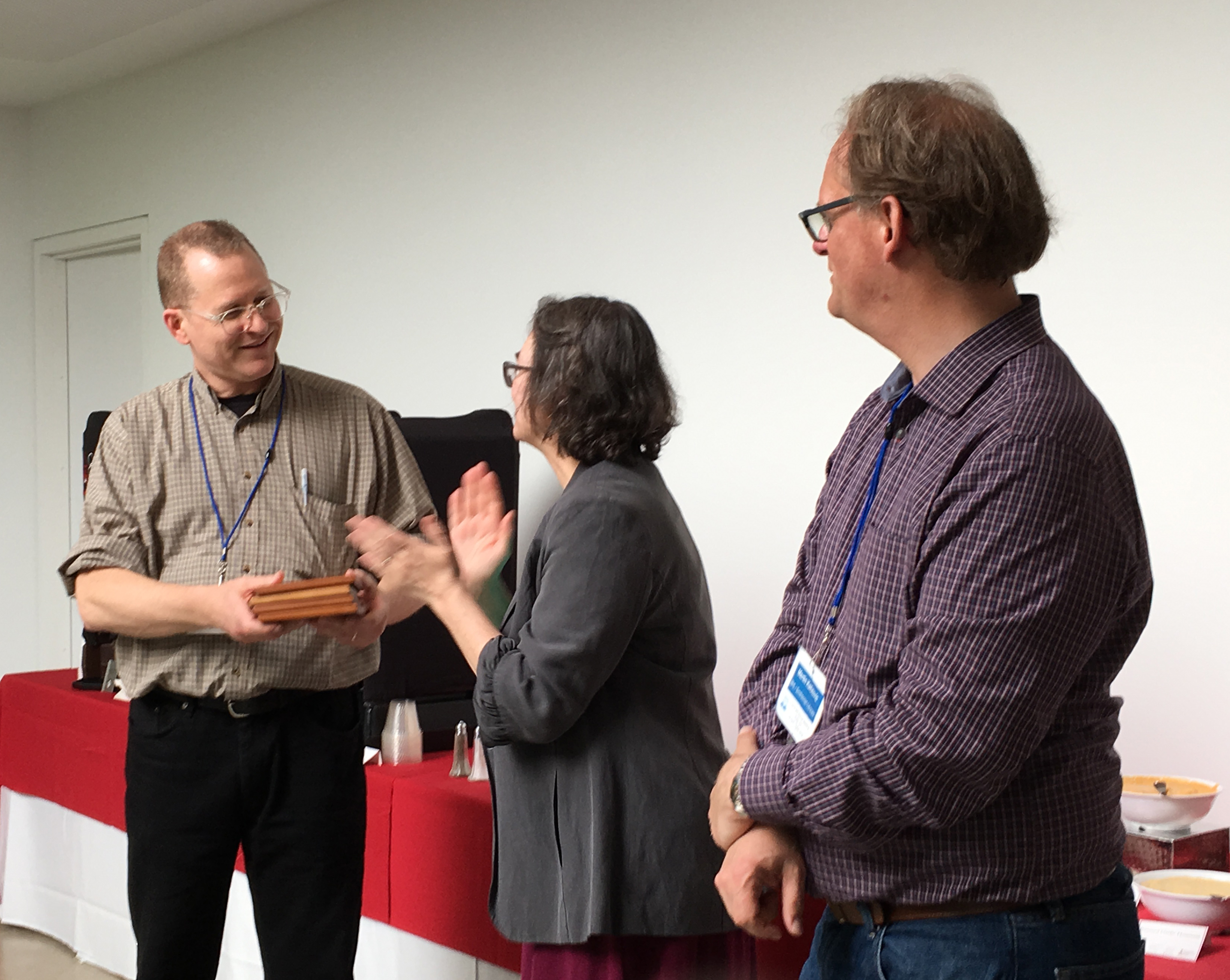 Host appreciation ceremony during the closing reception at the 2019 BHL Annual Meeting. Michael Cook (Albert R. Mann Library, Cornell University, left) being thanked by Constance Rinaldo (BHL Executive Committee Chair, center) and Martin Kalfatovic (BHL Program Director, right). Photo by: Grace Costantino.