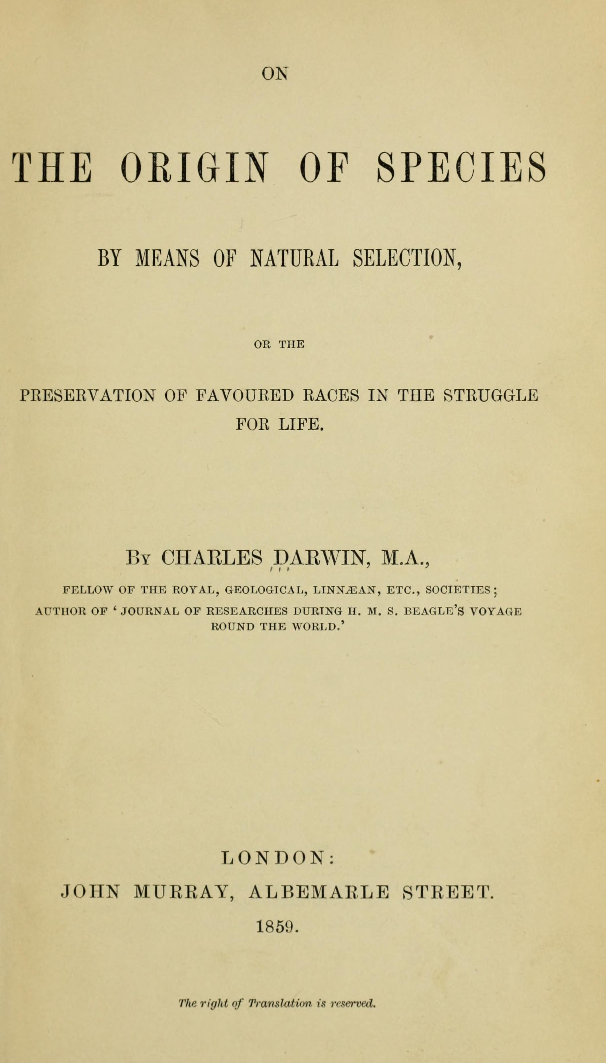 Title page. On the Origin of Species by Charles Darwin. Contributed in BHL from Harvard University Botany Libraries.