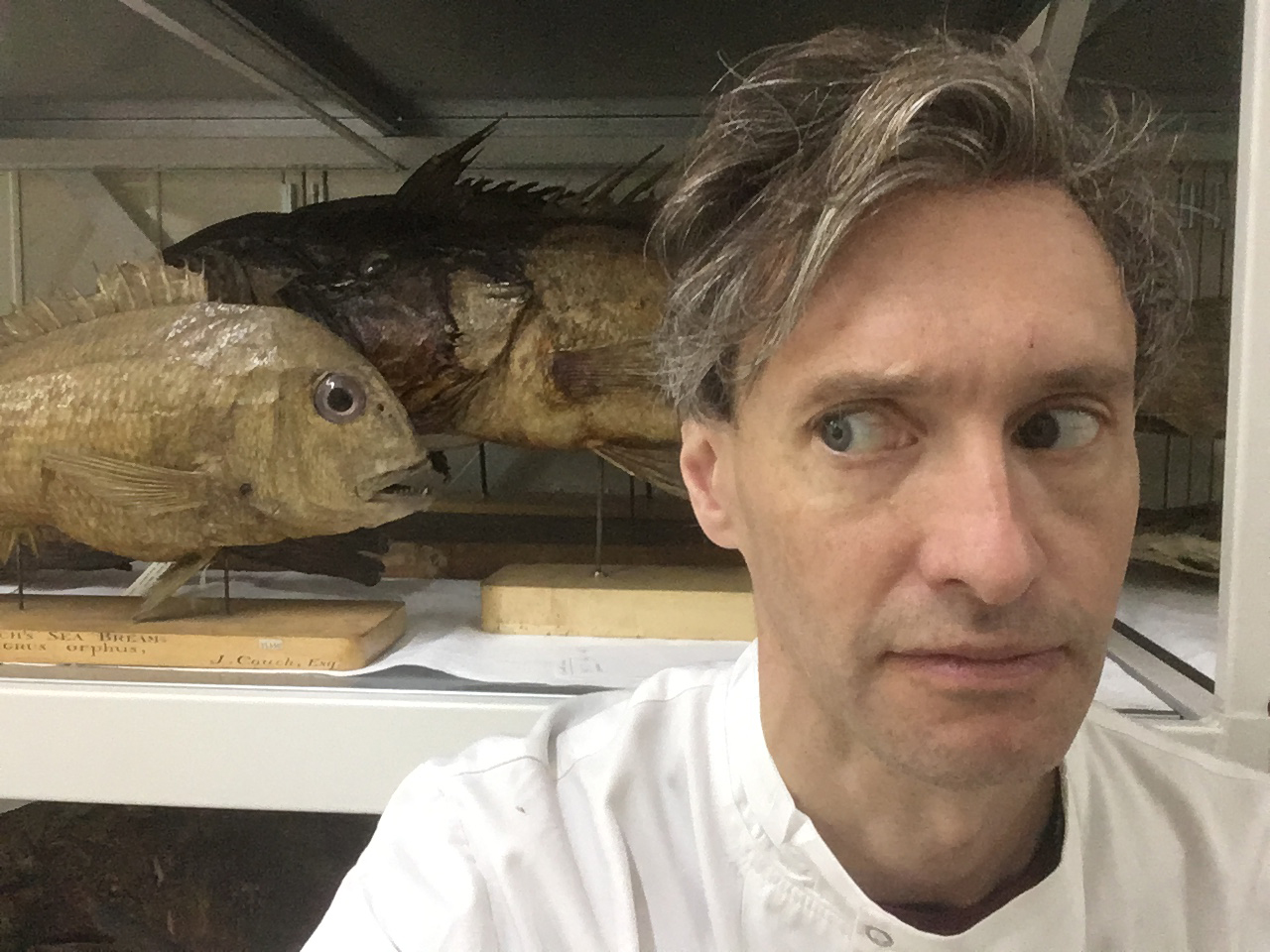 James Maclaine, senior curator of fishes at the Natural History Museum in London, with a seabream collected from Cornwall by naturalist Jonathan Couch in 1843. The specimen is housed in the Museum’s dry specimen store. Photo by: James Maclaine.