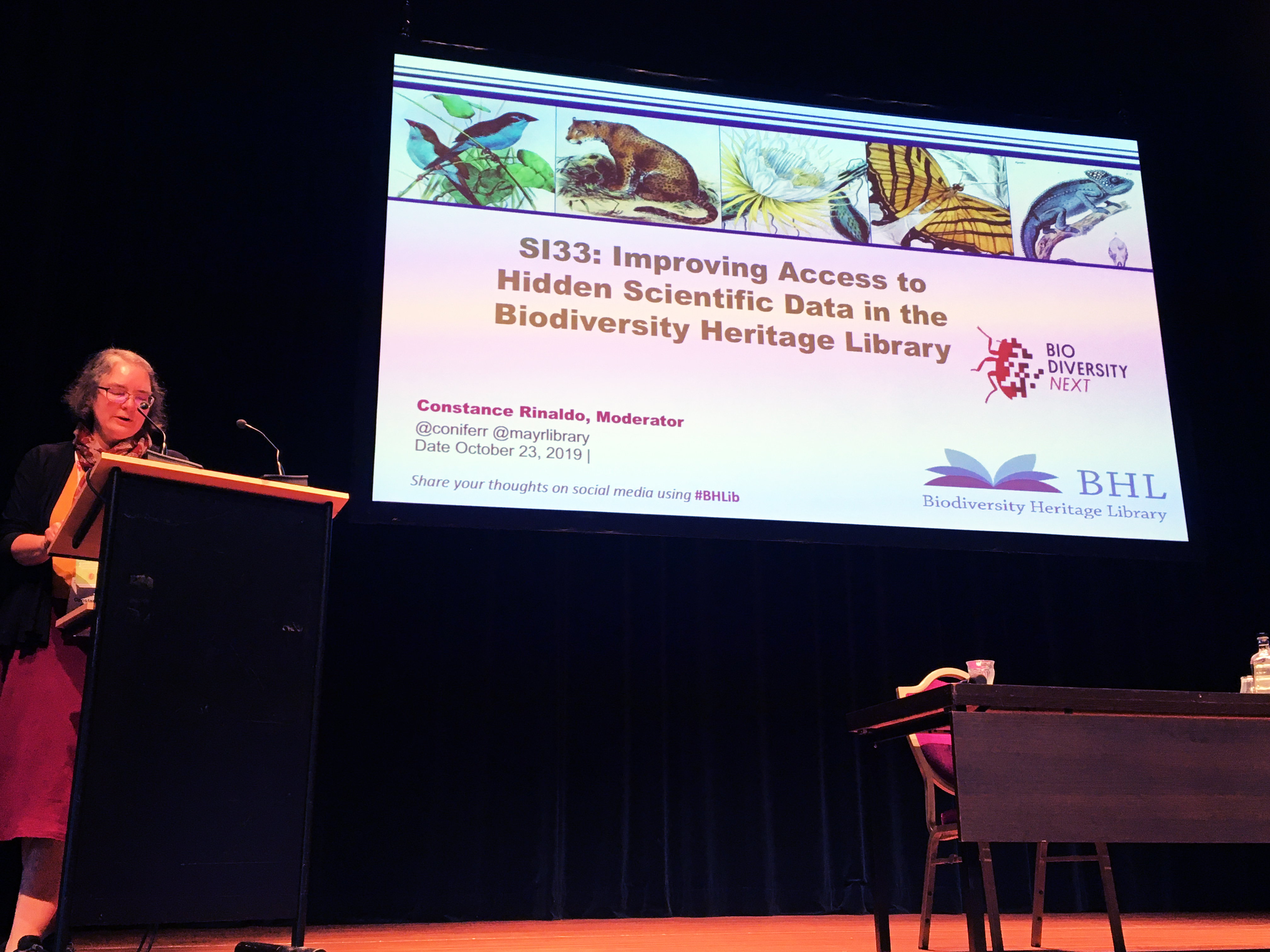 Constance Rinaldo introducing the BHL Symposium at Biodiversity_Next. Photo Credit: Grace Costantino.
