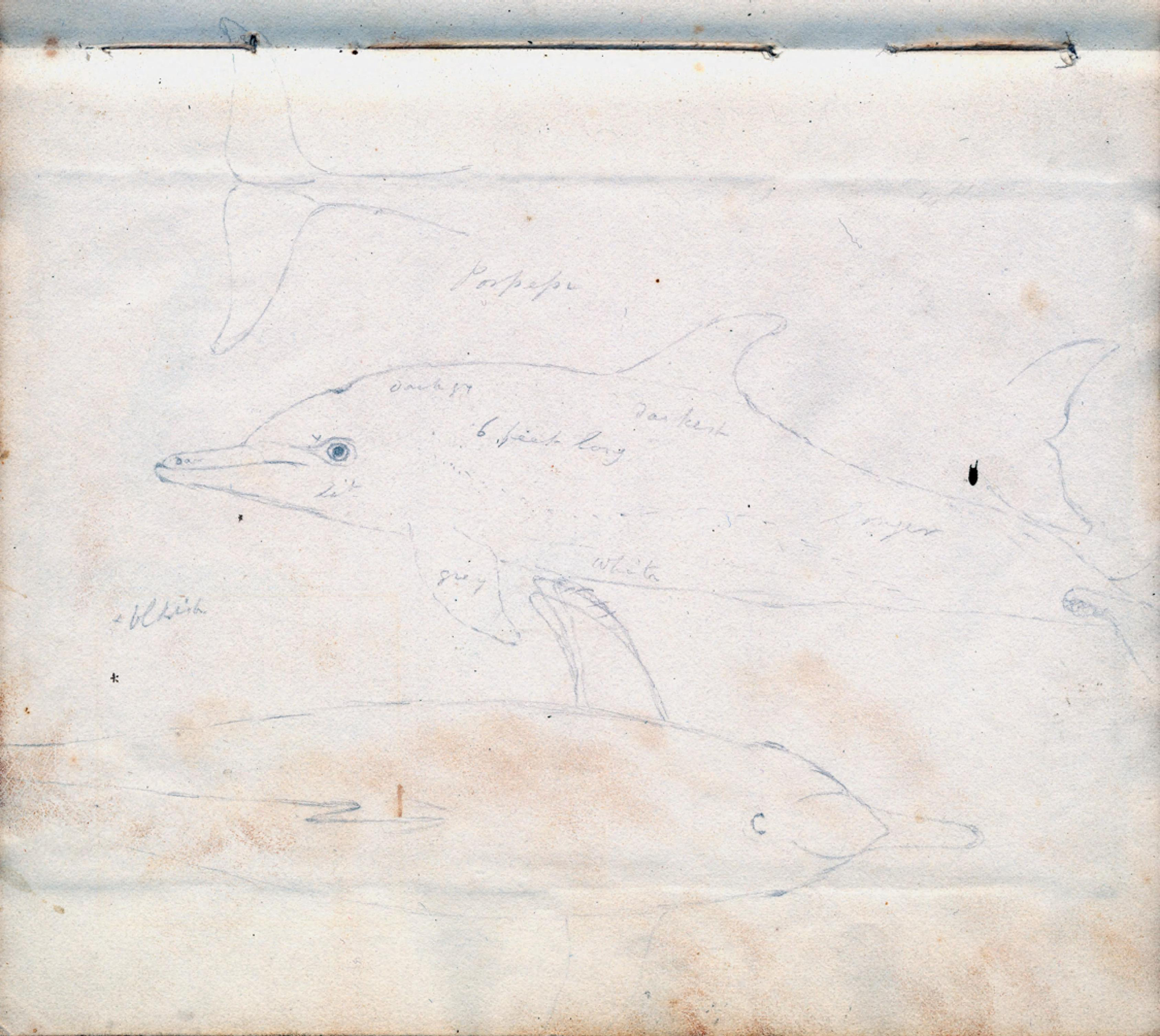 Dolphins, an unexpected inclusion in Gosse’s manuscript. Gosse, Philip Henry. Entomologia terrae novae. 1833. Contributed in BHL from the Canadian Museum of Nature Library / Bibliothèque du Musée canadien de la nature.