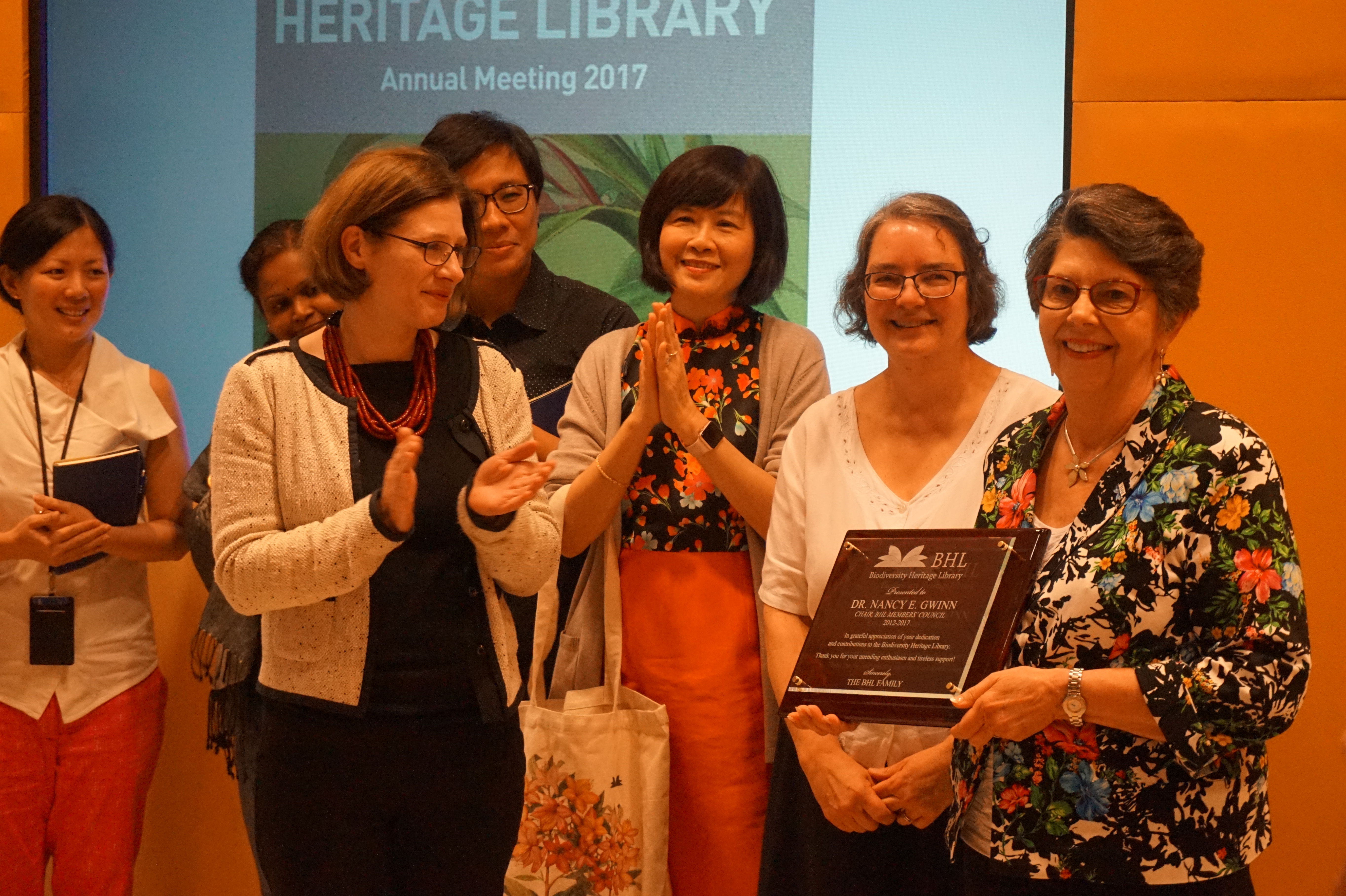 BHL Member representatives (L to R) Jane Smith (Natural History Museum, London), Wai Yin Pryke (National Libraries, Singapore), and Constance Rinaldo (Ernst Mayr Library, Harvard University) recognize Dr. Nancy E. Gwinn during a presentation ceremony honoring her five years as Chair of the BHL Executive Committee.