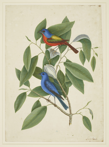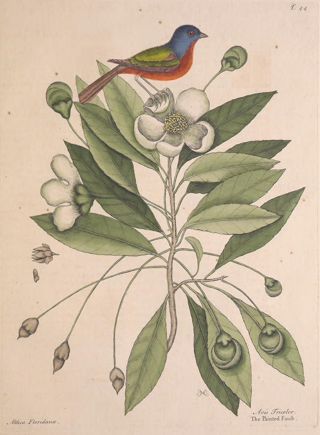 Illustration by Mark Catesby of Painted bunting Passerina ciris (L.), indigo bunting Passerina cyanea (L.), and sweet bay Magnolia virginiana (L.). Sourced from the Royal Collection Trust. Image metadata reads: “Inscribed on the recto in pen and ink in Catesby’s hand, upper right: ‘Tricolour. Ligurinus’; lower right: ‘Linaria Caerulea’; upper right corner ’44’. The Painted Finch appears in Volume I, Plate 44, and the Blue Linnet in Volume I, Plate 45, of Catesby’s The Natural History of Carolina, Florida and the Bahama Islands.” Source link: https://www.rct.uk/collection/925875/recto-the-paintednbspfinch-the-blue-linnet-and-the-sweet-flowering-bayverso-the