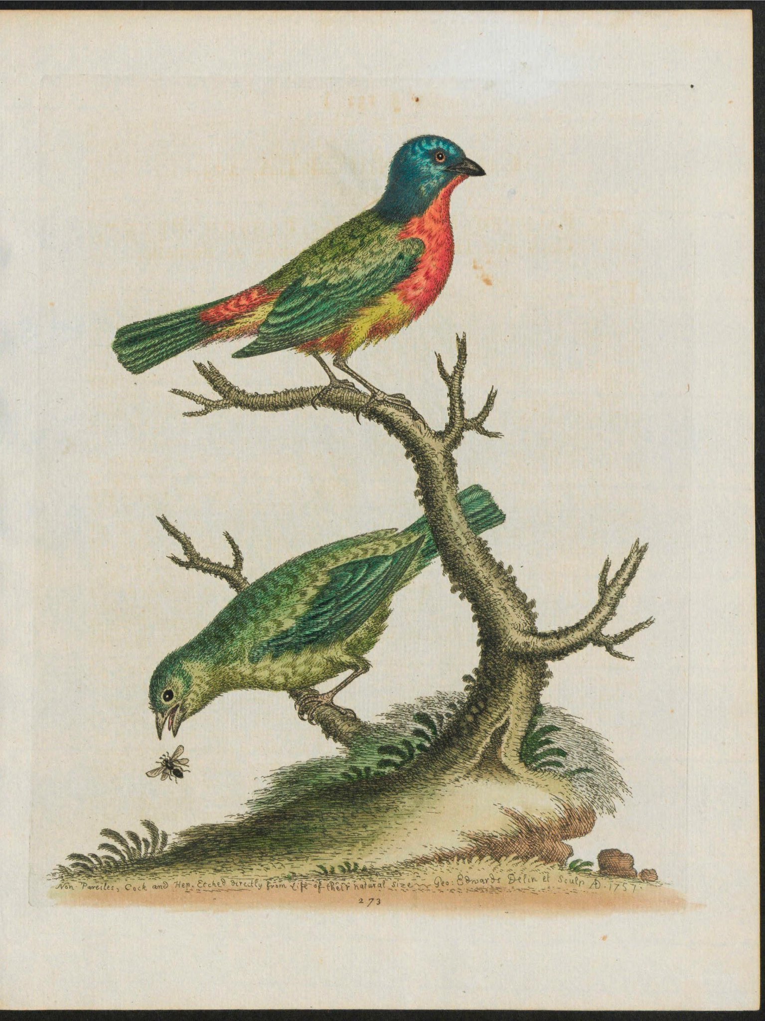 These errors, at first regard trivial, are in fact revelatory of George Edwards’s crucial role as the link between the ornithologies of Catesby and Linnaeus. In his Natural History, published the year after Catesby’s death, Edwards corrected what he believed was his friend and mentor’s misapprehension. Edwards wrote that the tricolored bird of Catesby’s Plate 44—a Painted Bunting—and the blue bird of Plate 45—an Indigo Bunting—“are both the same; the one not arrived at its perfect Colour, and the other perfect…. This Bird in its first State resembles a Hen Sparrow, its second is Blue, and its last as the above described [that is to say, the particolored adult male Painted Bunting], with many intermixed Stages between each of these” (Edwards 1750).
