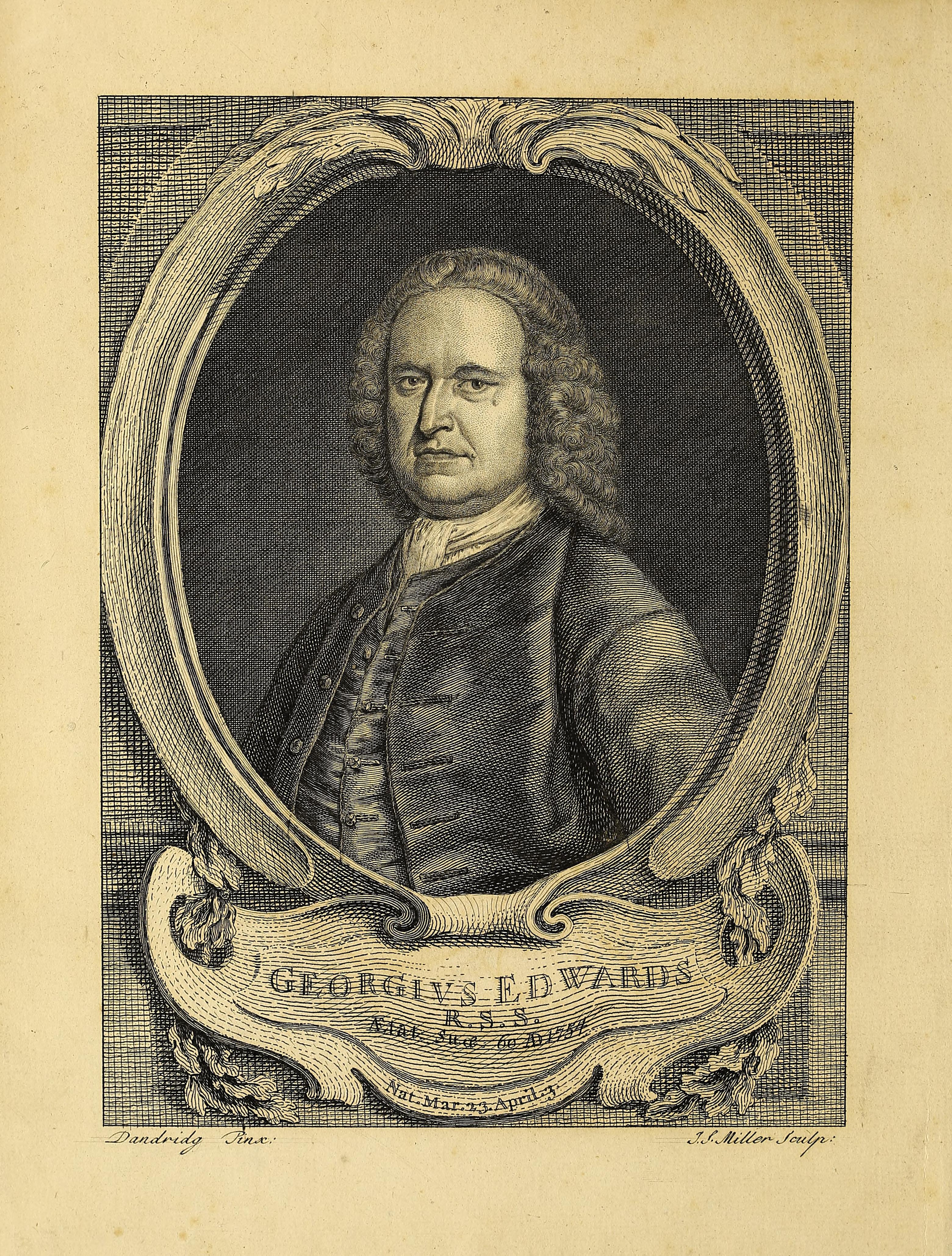 In a 1759 letter introducing Edwards to Daniel Solander, the Swedish taxonomer names Edwards as preeminent among contemporary ornithologists, and pronounces himself happy to have lived to see the Englishman’s work with his own eyes (Linnaeus 1759). On the completion in 1764 of Edwards’s Gleanings of Natural History, Linnaeus would send his congratulations for having introduced to science “so very many extraordinarily rare birds, such a number as no one else has ever discovered or ever will, or far less will ever illustrate them so vividly that your birds are lacking only their song. They will sing your fame for as long as there are birds and men. Thanks to them, you have become an immortal ornament to our age…. Count me among your sincere admirers!” (Linnaeus 1765).