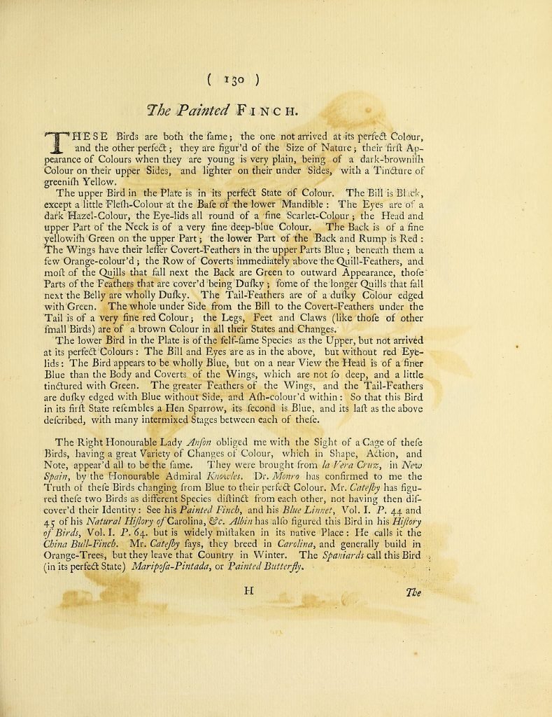 In London, Edwards had studied a cageful of buntings of various colors, brought to Lady Anson from Mexico by Admiral Knowles; the conclusions he drew about the species’ plumage sequence were affirmed by his friend and patron John Monro (Edwards 1750). Linnaeus’s citation to “Catesby” notwithstanding, it was Edwards’s assessment of the buntings as “both the same,” and not Catesby’s original identification of two distinct species, that entered Linnaeus’s Systema in 1758.