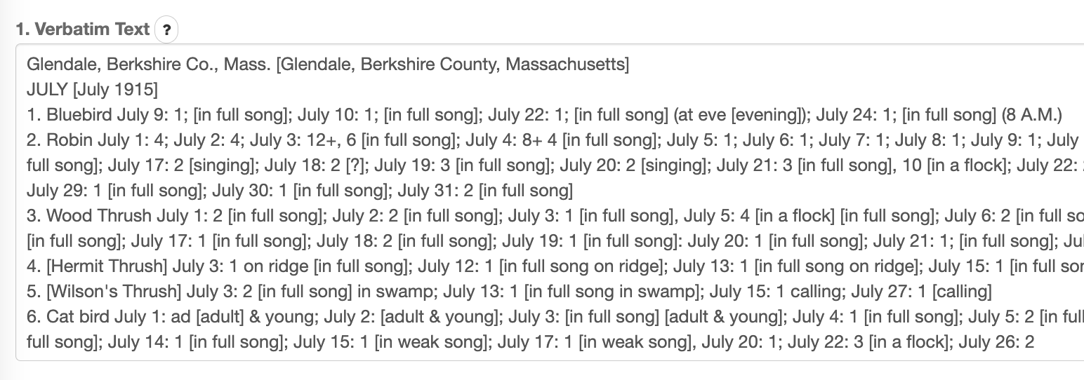 Figure 4 below shows one example of Brewster’s extensive species lists. Brewster fastidiously recorded all essential elements of a species occurrence record and often more such as habitat information and detailed behavioral descriptions. The complexity of this example, featuring Brewster’s unique formatting, use of ornithological symbols, and tiny, crowded handwriting, highlights the value of crowdsourced human transcription by a team of enthusiastic, dedicated volunteers.