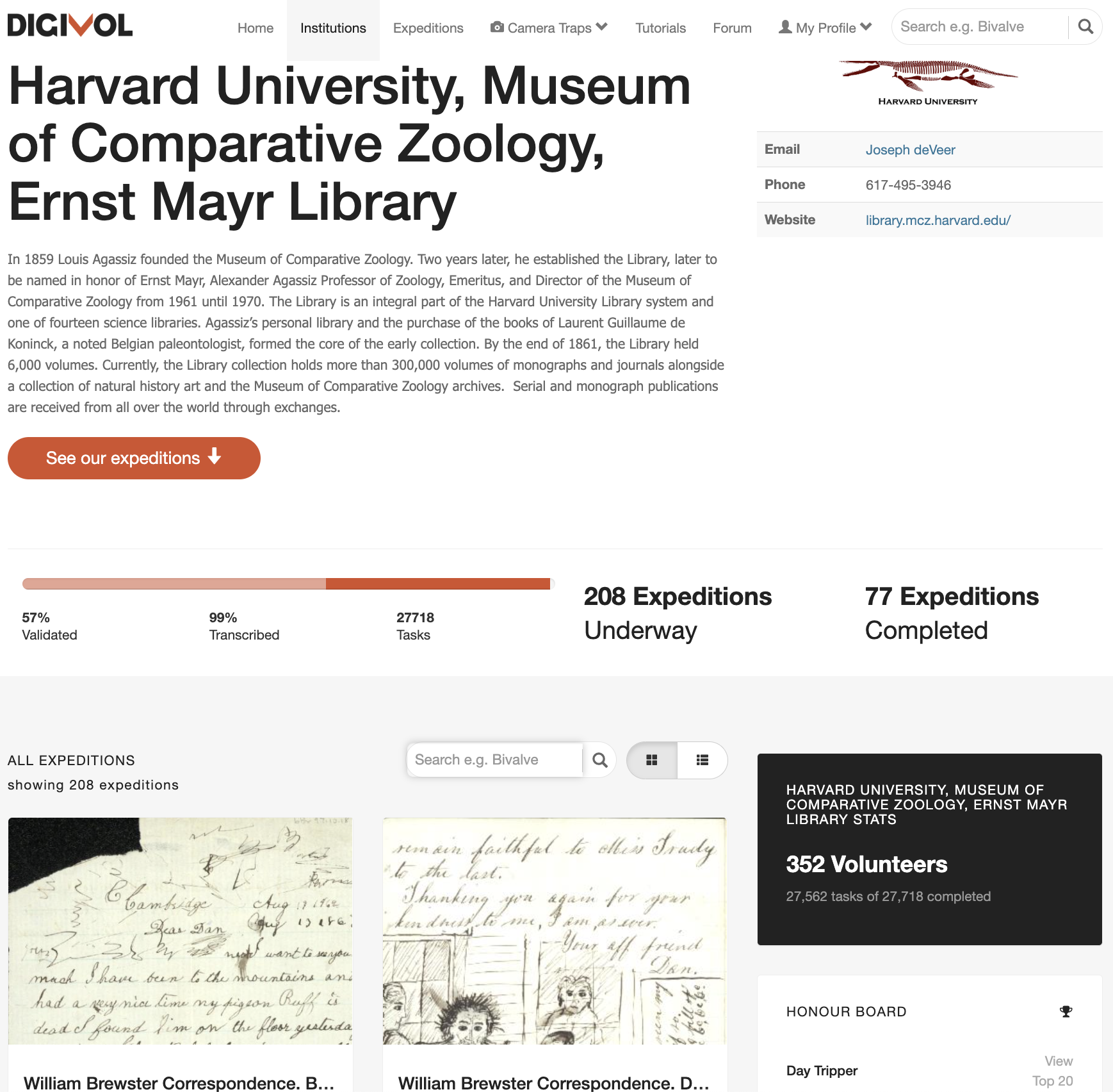 DigiVol, first developed in 2011 to crowdsource the transcription of specimen labels, enables institutions around the world to engage volunteers to extract data of various types, such as text, species identifications, and species traits from images. Each institution is able to upload images and manage their crowdsourcing project through the DigiVol platform. Through a combination of gamification and engagement tools such as a user forum and secure, private emails, institutions can build volunteer skills, a sense of community, and commitment.