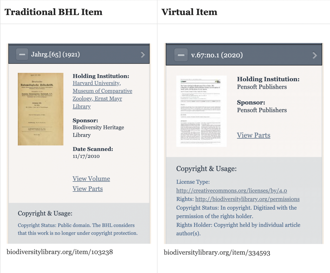 Equally transformative to BHL’s data quality gains was the introduction of “virtual items,” a feature that allows born-digital articles and e-content from data feeds like OAI-PMH and Crossref APIs to be grouped into cohesive BHL items. Virtual items enable modern journal articles to be presented alongside BHL’s traditionally digitized historic books and journals. To learn more about Virtual Items, please check out the BHL FAQ.