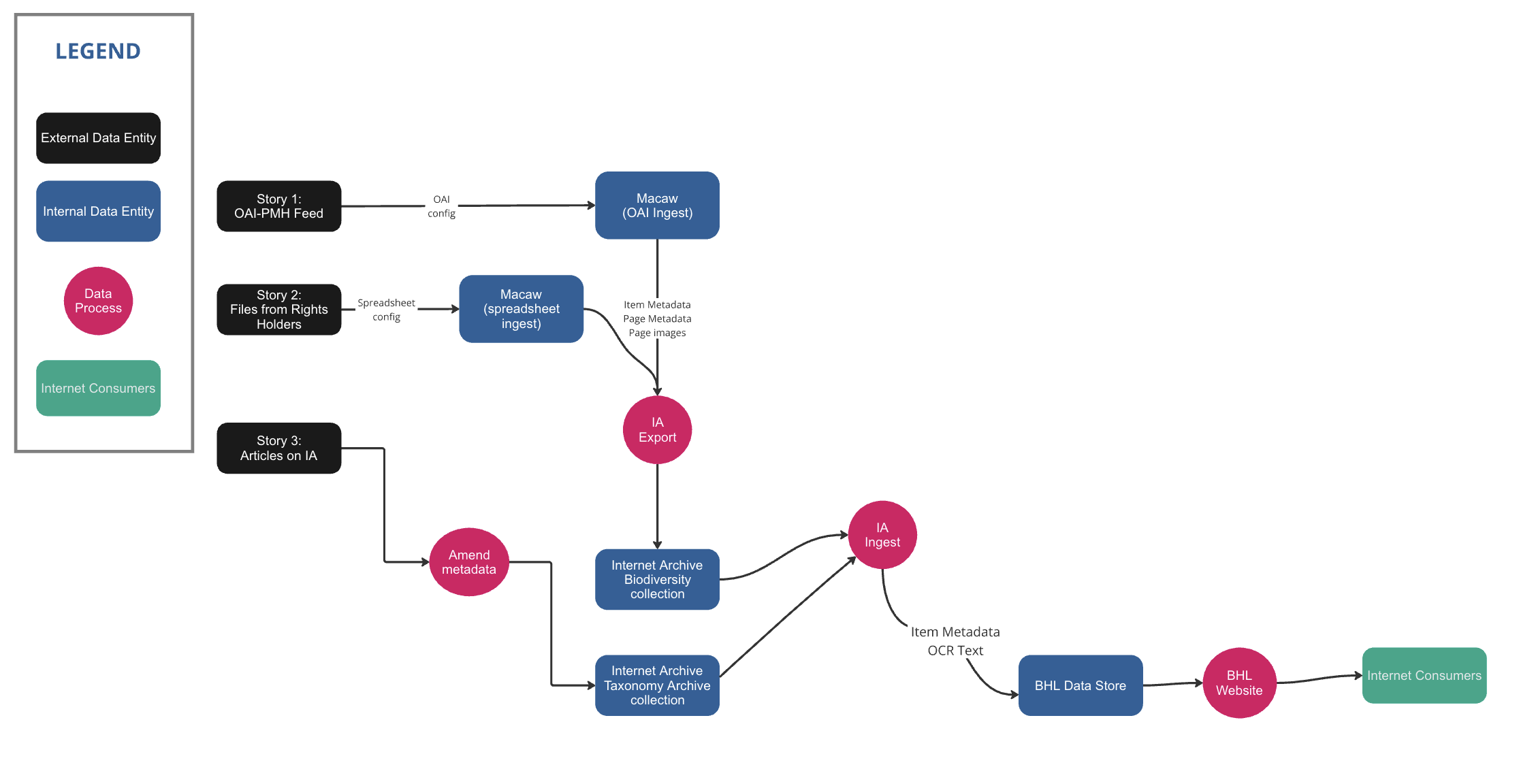 The data flow journey for Virtual Items is actually quite different from traditional BHL content. For this new feature, the BHL Technical Team had to carefully consider the various data sources and how those would flow into the BHL data ecosystem and be presented to users. Image Credit: BHL Technical Team Collaborative Mapping