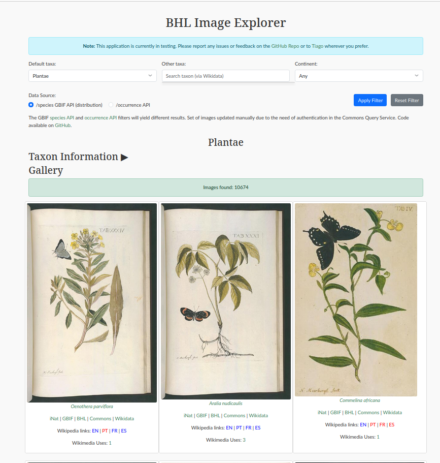 One particularly impactful creation was the BHL Image Explorer, an intuitive tool enabling easy discovery and reuse of BHL images on Wikipedia. Developed iteratively with user feedback, it offers robust taxon- and location-based searches drawing from the GBIF API, interactive navigation, and detailed Wikimedia reuse statistics. It is a demonstration of how the structured data can be leveraged to improve navigability of image collections as well as aiding Wikimedia volunteers in extending the reach of illustrations.
